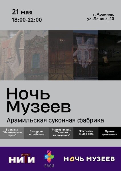 21 мая Музей города Арамиль приветствовал гостей на Всероссийской акции «Ночь музеев», которая проходила под названием «PRO-текстиль» на территории суконной фабрики, когда-то легендарном и самом крупном градообразующим предприятии Арамили.